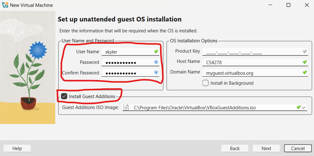 Next, set up your account information. Select a username and password for your login details and make sure to check Install Guest Additions. This is in an ISO file that should have been placed in the right location when you installed VirtualBox: