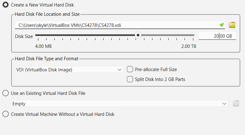Then it will ask you to create a storage device. Remember, you are creating a virtual machine — an entire simulated computer. That includes simulating a hard disk for storage. This is represented as a large (> 20GB file) on your host computer. I recommend at least 20GB, since the space will be dynamically allocated as long as you don't choose "Pre-allocate full size":