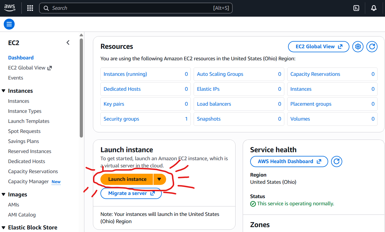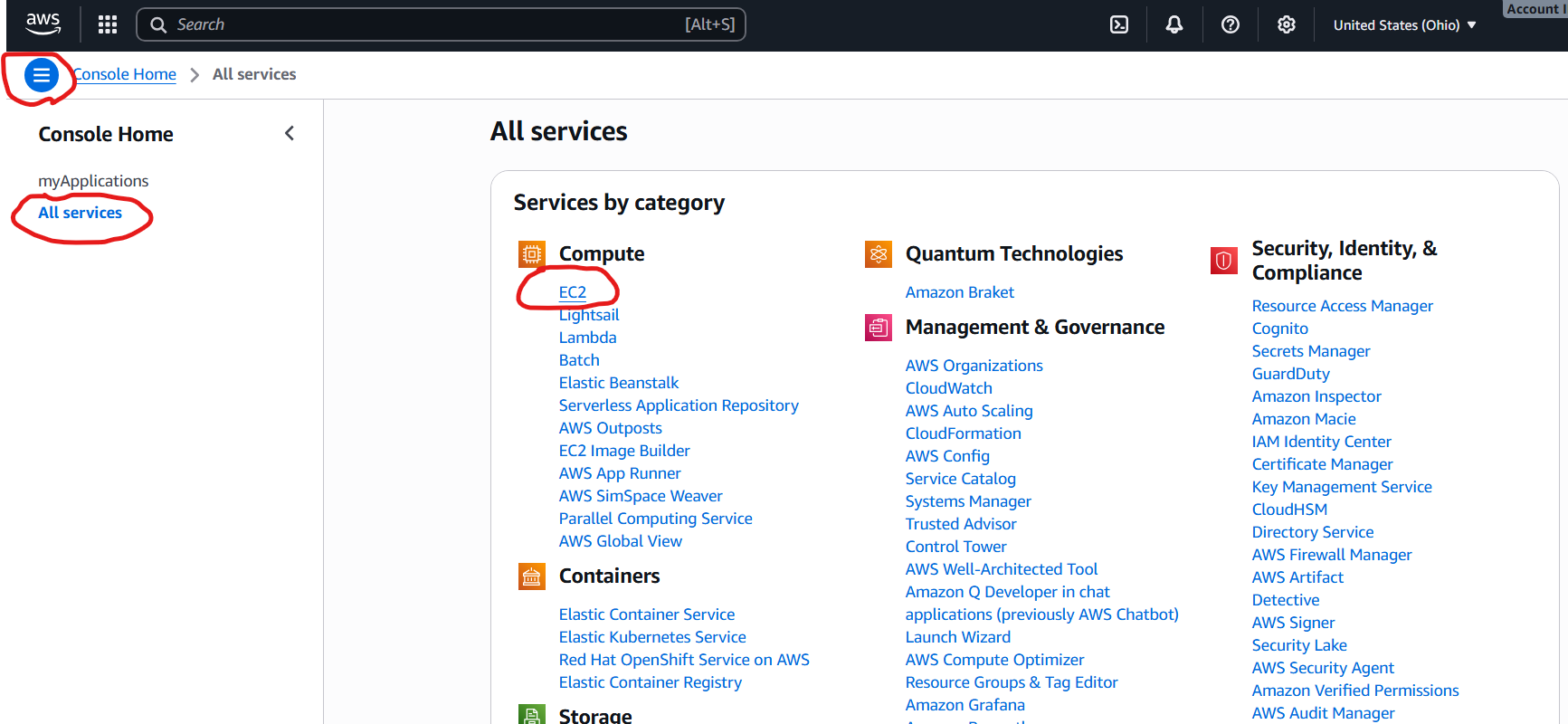 From the AWS Console, click the hamburger menu button in the top left, select All Services and then the EC2 link to open the Elastic Cloud Compute manager. The EC2 Manager lets you manage and launch Instances, which are virtual machines that you configure. The first thing we need to do is configure and launch a new instance.