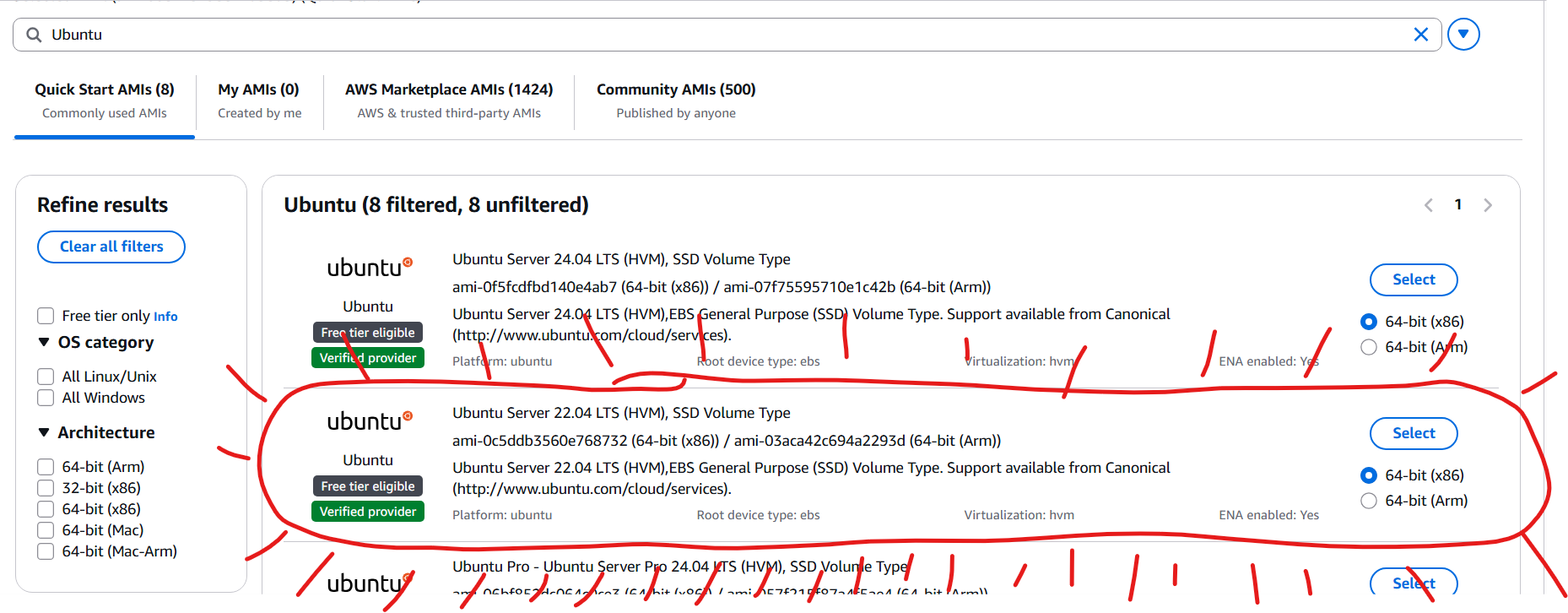 This is the most important step. You must select an Ubuntu Server 22.04 LTS (HVM), SSD Volume Type instance. This is a free tier eligible instance that contains an environment suitable for completing the rest of the assignments. Don't pick other versions of Ubuntu (NOT 20.04 or 24.04, etc.). The AutoGrader uses Ubuntu 22.04, so if you want the smoothest experience, use that version.