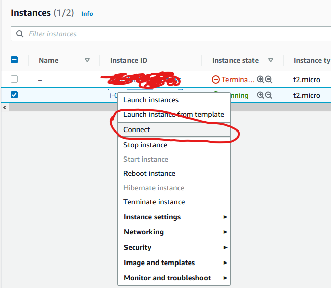 From the EC2 Management Dashboard, right-click your running instance. You should see a menu pop up like below: