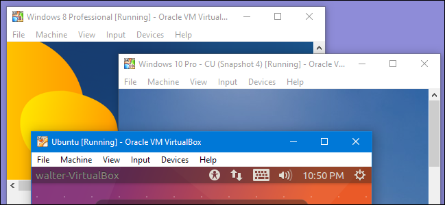 This is a Windows 10 host computer running three different Virtual Machine guests. The guest instances are complete (virtual) environments that are isolated from the host. All of the guests share the host's hardware as they execute — each window in the screenshot above lets you interact with a separate emulated guest.